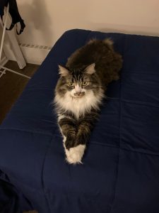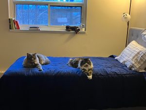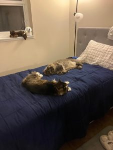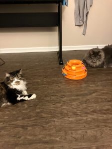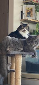 Adelaide (female) and August (male) are a sweet, bonded pair. They warm up to people pretty quickly as long as they are given their space for the first couple of days. While they can be independent and like to spend time on their own, more often than not you will find them following you around and giving you company. Gus likes to sit on your table as you work while you will find Addie stealing your chair! They are both gentle and calm cats. Addie is the more talkative one and tends to chirp back when you speak to her. She likes to play with all cat toys and especially enjoys those with catnip. When he’s in a playful mood, Gus enjoys playing with the cat wand. They both adore pets and kisses and will immediately start purring when you pet them. They will both definitely be sweet members to add to your family!