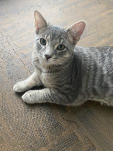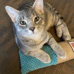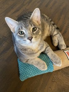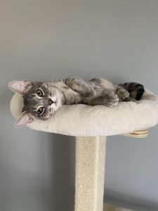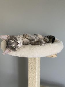 Ash is the most rambunctious of his siblings – you’ll almost always find him on the go! When he’s not wrestling with or chasing after his brother and sisters, you’ll find him batting around his favourite toys! Ash would benefit from an adopter ready to dedicate time to daily play to help expend his energy! Ash is still learning his manners and can play rough so he would be best suited to a home without young children.
