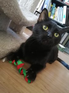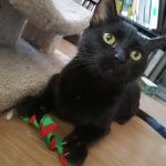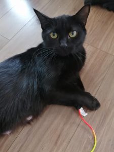 Ebony is a social butterfly who LOVES attention. She will charm you with her silky soft fur and her quiet, squeaky meows! She loves people, and she will eagerly accept pets and playtime. She doesn’t mind being picked up, and it doesn’t take much to make her purr. When she was found, she had recently had kittens. Her time on the streets must have been rough… she gets EXTREMELY excited about food, and is still learning her table manners (not to counter-surf, not to eat food that doesn’t belong to her, and not to chew through her food/treat bags). Ebony has difficulty understanding boundaries, so other friendly or laid-back cats would make the best siblings for her. Ebony is a bold and sweet little girl who absolutely loves to spend time with you!