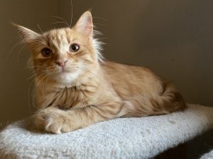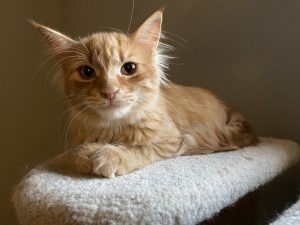 Effie is the smallest and shyest of her siblings and looks to them for guidance when interacting with her foster. Effie is still learning to enjoy pets and is happiest running around and playing with her siblings. She would love to be adopted with one of them. She is startled by fast movements and loud noises and is best suited to a quiet and calm home that is adult-only or with older children with previous cat experience.