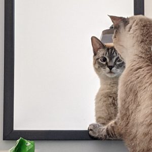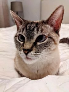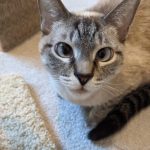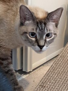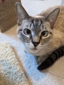 June was very scared and always hiding when she first arrived, although never aggressive with her fosters. She still hides in the closet but a lot less than before (she even opens the sliding door to get into it, even if there’s stuff blocking it). She has gotten more comfortable around her fosters, but she won’t come right up to them unless they have treats. They can approach her and pet her, and she really likes pets. She has a habit of “love biting” once in a while when she’s getting nice pets (hard but not breaking the skin), so that’s something to be aware of but it can be corrected. Her fosters have never seen her play. She can be picked up but doesn’t like it (freezes or makes a noise, is scared). She has had virtually no interest in leaving their room although she’s left briefly once or twice and is probably scared of the resident cats but she’s not aggressive with them. She likes to be up high – if she’s out of the closet she’s sitting on a perch, in a pet bed that’s on top of a desk, or sitting a the windowsill.