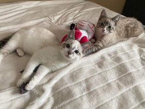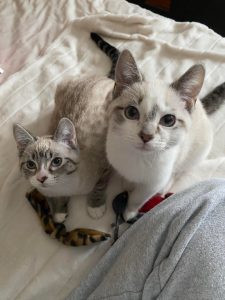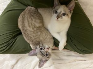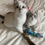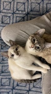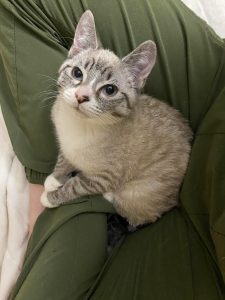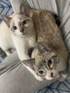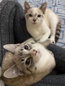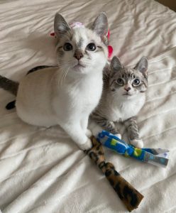 Despite a difficult start to life Mac and Flurry are two of the most loving kittens you’ll ever meet. They share a special bond and you’ll never find them far from one another. In typical kitten fashion they love to run around and play. They especially love to bat around balls and cat nip toys. When they aren’t playing you’ll find them sunbathing or cuddling with one another. They are very affectionate kittens. They’ll greet  you with purrs and love to be pet and to cuddle. If you sit down be prepared for them to immediately climb into your lap.