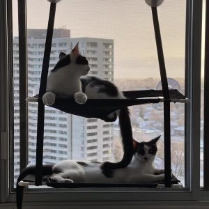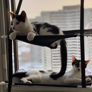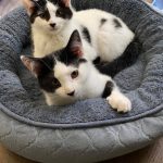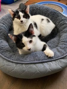 Miller (m) and Ambroise (f) are a bonded pair available for adoption together to a quiet, adult-only home. They’ll require a patient adopter willing to provide ongoing socialization.