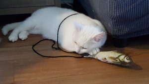 Her favorite toys include: ping pong balls, string, and any soft toys she can batt around and kick.